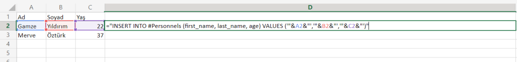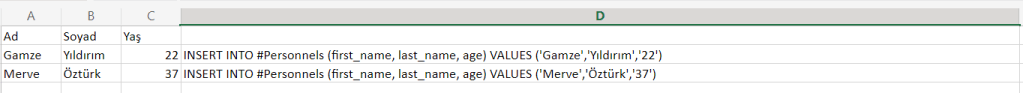Excel’deki bu verileri Sql Server’a aktarmak için bir insert sorgusu oluşturacağız. Bunun için D sütununa gelip aşağıdaki gibi bir formül yazıyoruz.