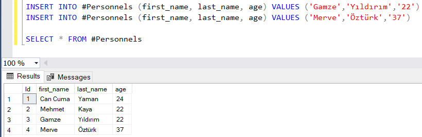 Öncelikle Sql Server’da #Personnels adında bir temp tablomuz yer almaktadır. Bu tablonun içeriği aşağıdaki gibidir.