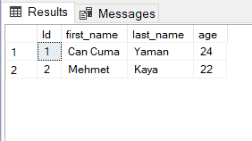 Bu sorguları alıp Sql Server da çalıştırdığımızda aşağıdaki gibi Excel’den Sql Server’a verileri aktarmış oluyoruz. Burada Id alanımız primary key identity(1,1) olarak ayarlandığı için bu alanı sorguya eklemeye gerek yoktur.