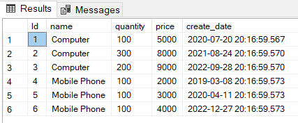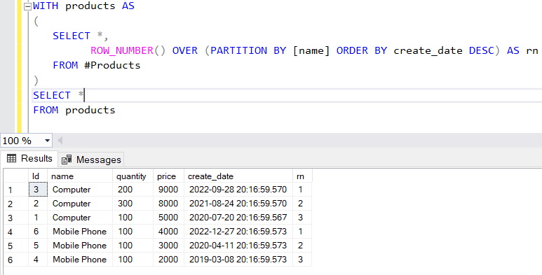 Burada yapılan işlemi özetlemek gerekirse Products tablosunu name alanına göre gruplayıp bu kayıtları create_date alanına göre sıralıyoruz. ROW_NUMBER() ile her bir satıra bir sıra numarası veriyoruz. Örneğin bizim tablomuzda 3 adet Computer isimli kayıt vardı. Bunları tarihe göre sıraladığımızda en güncel kaydın sıra numarası 1 sonraki güncel kaydın sıra numarası 2 en eski Computer kaydının sıra numarası ise 3 olmaktadır.