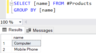 Bu tabloda Computer ve Mobile Phone ürünleri tekrar etmektedir. Burada tekrar eden kayıtları teke düşürmek için aşağıdaki gibi bir group by kullanımı yapılabilir.