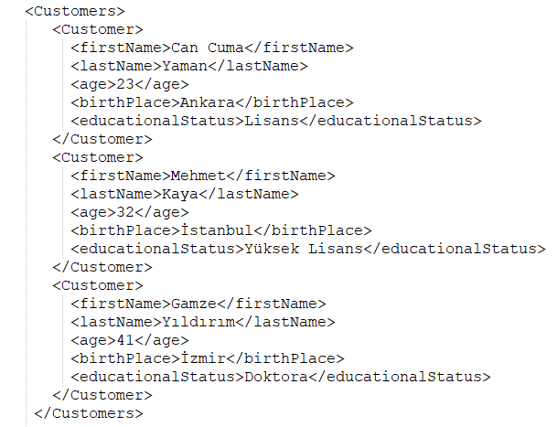 Aşağıda çok basit anlamda bir XML verisi gösterilmiştir. Bu XML dosyası rastgele oluşturulmuş müşterilerin bilgisini tutmaktadır.